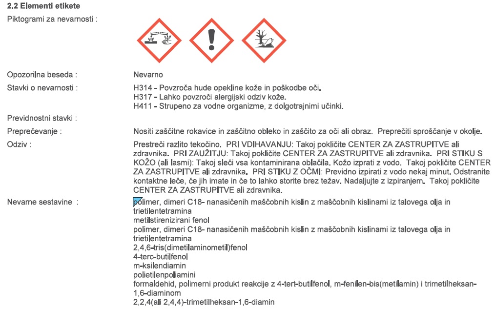 “Pred uporabo natančno preberite etiketo in upoštevajte navodila za uporabo! Nevarne lastnosti izdelka si oglejte v varnostnem listu v poglavju 2, v točki 2.2 Elementi etikete« ali na etiketi. Varnostni list odprete s klikom na naslednjo povezavo:
